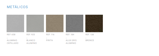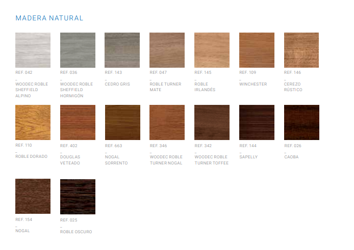 - Variedad de acabados: Disponibles en una amplia gama de colores y texturas, incluyendo imitaciones de madera y acabados metálicos, permitiendo una personalización acorde al estilo de cada proyecto.